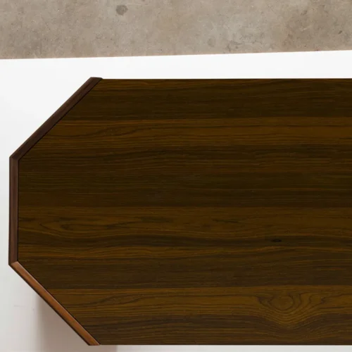Phần thân bàn được hoàn thiện với lớp phủ gỗ Canaletto bóng, tôn lên vẻ ấm áp tự nhiên và độ sâu tinh tế của từng thớ gỗ. Kết hợp cùng chi tiết kim loại phủ sơn màu nâu Testa di Moro bóng, Metropolis tạo nên cảm giác vững chắc, sang trọng mà vẫn thanh thoát.