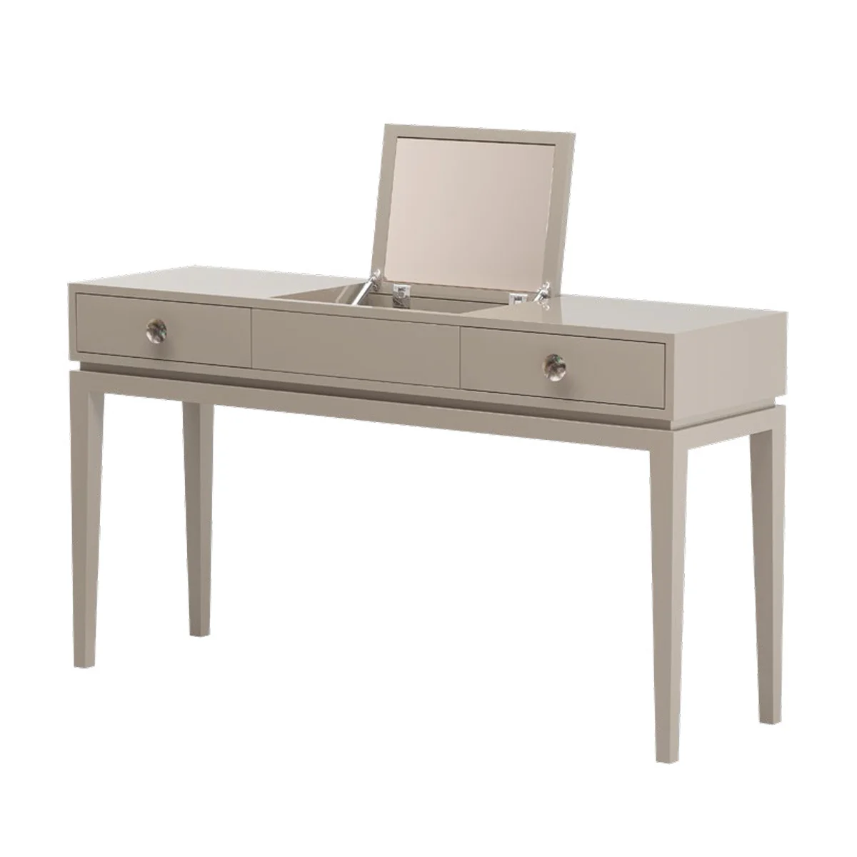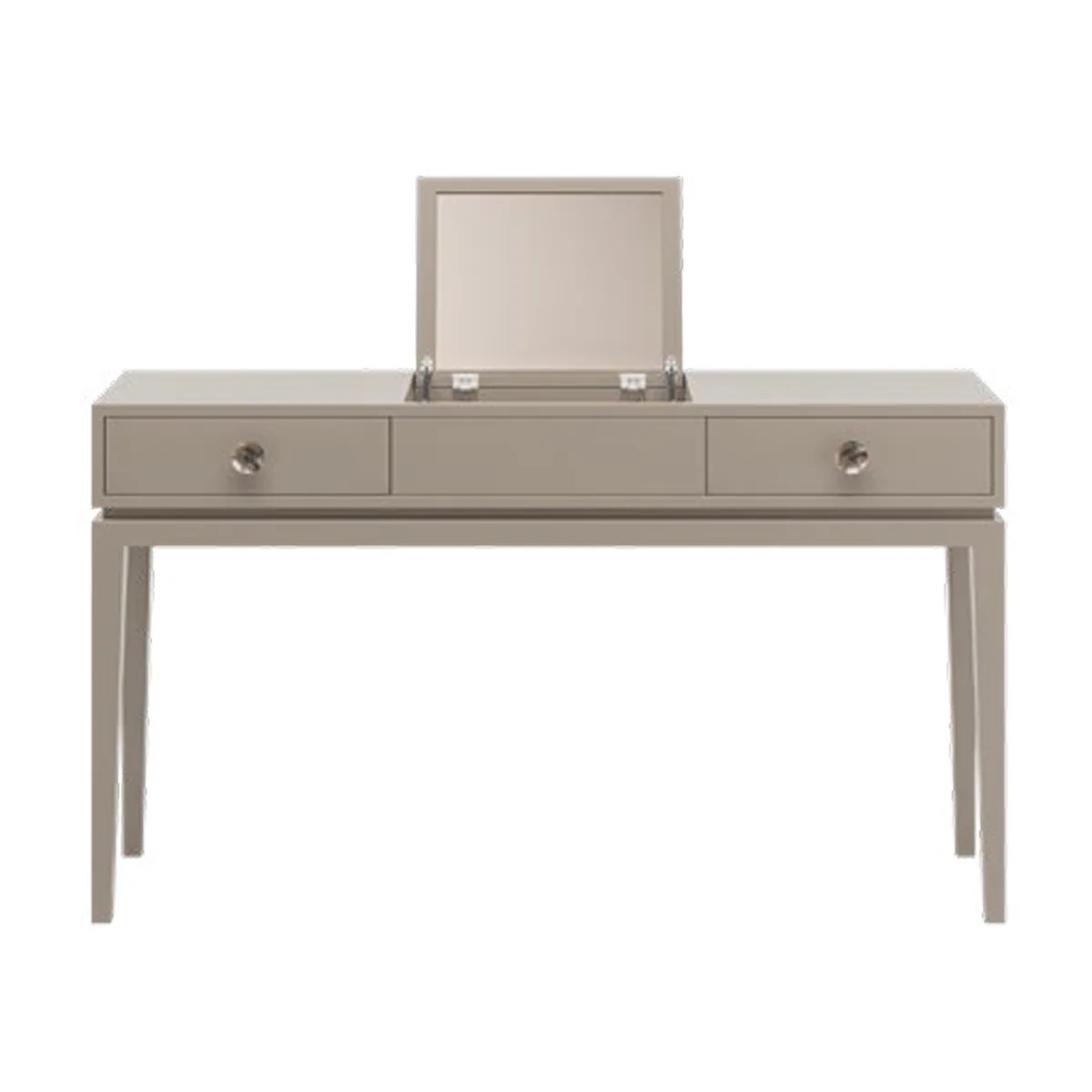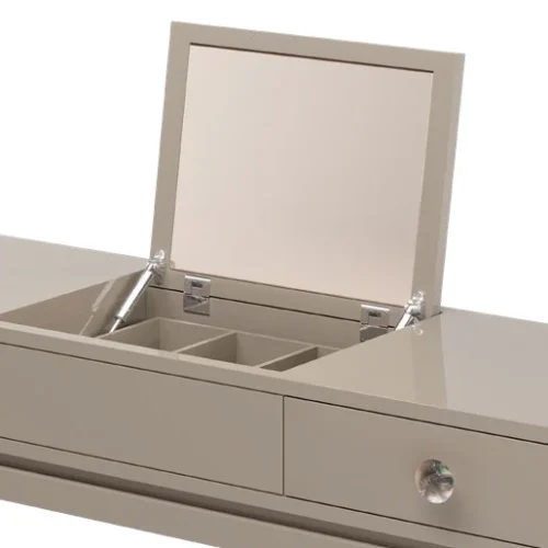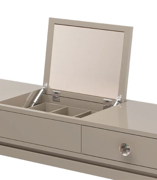 Bàn trang điểm Chicago là sự kết hợp hoàn hảo giữa phong cách hiện đại và sự tinh tế trong từng chi tiết. Toàn bộ phần hộp và mặt ngăn kéo được hoàn thiện bằng gỗ sơn mài High Gloss, tạo nên bề mặt sáng bóng và sang trọng. Bên trong, lớp gương trong suốt được ốp tỉ mỉ, mang lại chiều sâu và hiệu ứng phản chiếu độc đáo, trong khi mặt lưng được nhấn nhá bằng gương đồng tinh xảo, tăng thêm vẻ cuốn hút cho tổng thể.