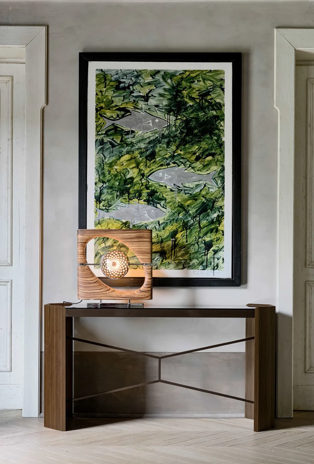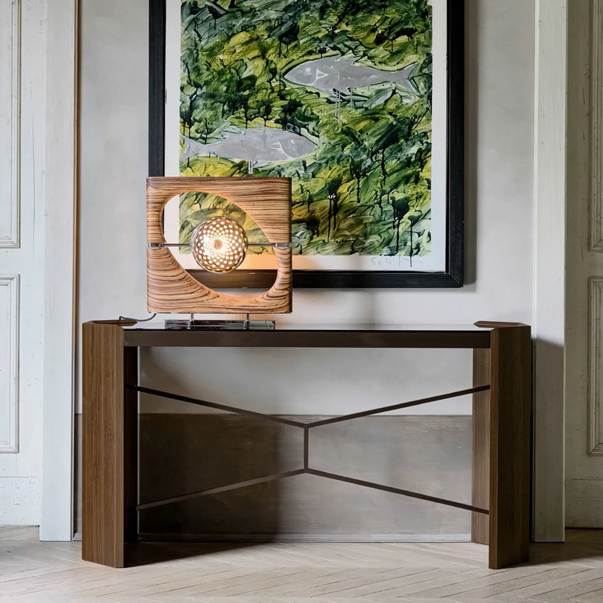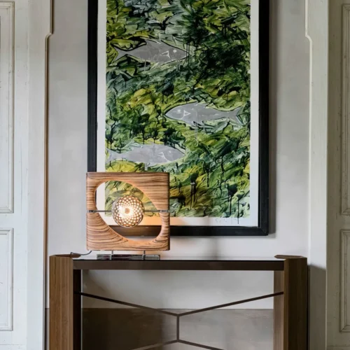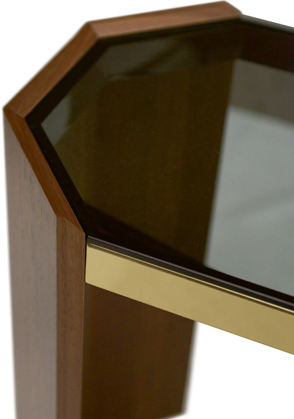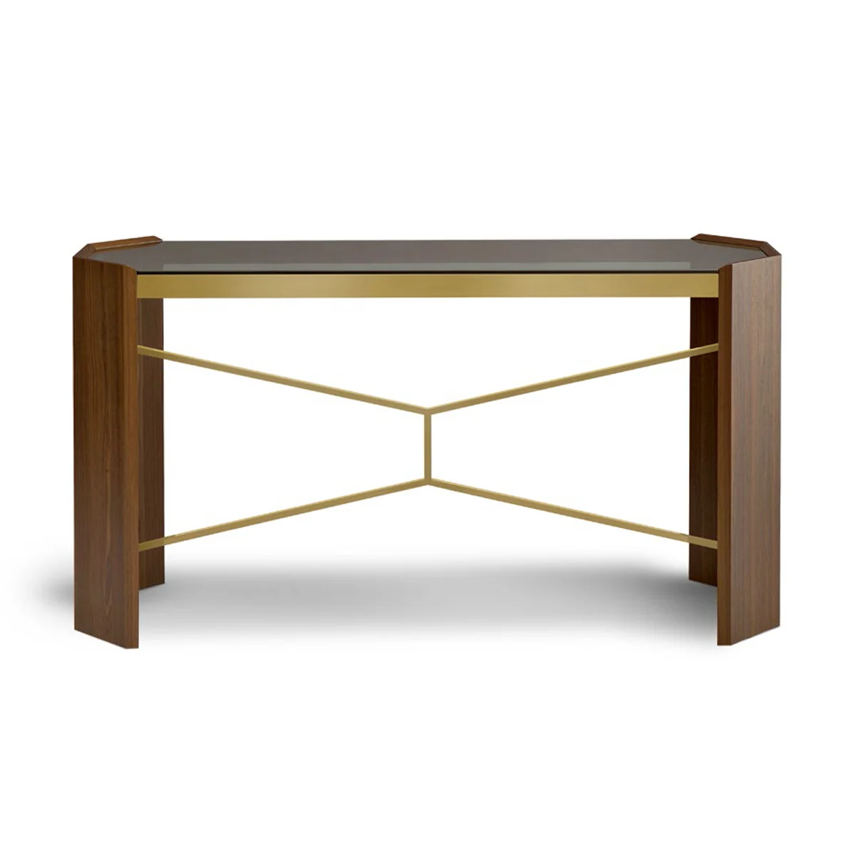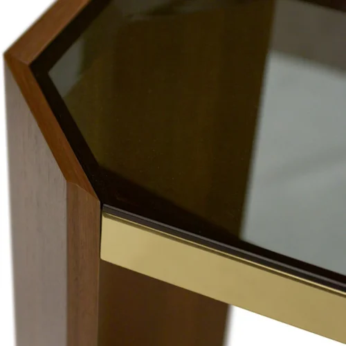 Phần mặt bàn kính Fumé trong suốt tạo nên hiệu ứng thị giác nhẹ nhàng, giúp tổng thể vừa sang trọng vừa thanh thoát – một lựa chọn hoàn hảo để làm nổi bật không gian sảnh, phòng khách hay khu vực trưng bày nghệ thuật.