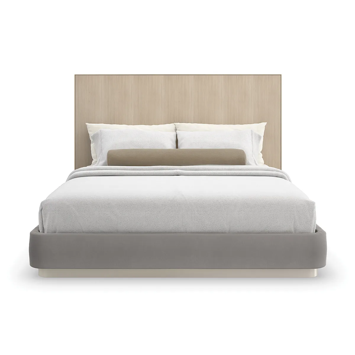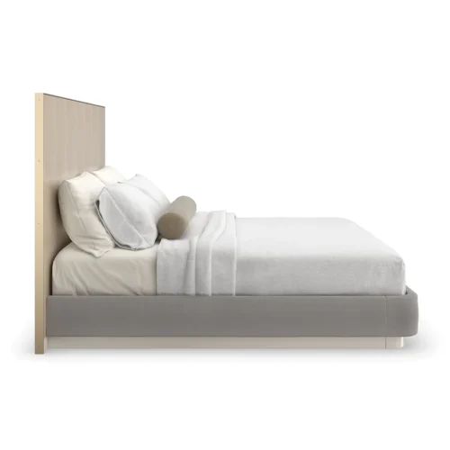 The bed frame is enveloped in a soft and elegant light gray mohair velvet fabric, while the footboard and sides are gently rounded, creating a weightless feeling as if floating on a wooden plinth finished in Cloud color. Additionally, the King Dream Chaser Bed is also available in a version with curved wooden wings on both sides, creating a more majestic and captivating appearance for the bedroom space.