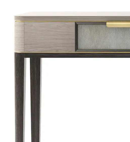 The drawer fronts are overlaid with premium faux leather, while the main structure is crafted from solid wood with a matte satin finish, ensuring both durability and natural beauty. The drawer interiors are lined with soft suede, cradling every item used daily. Brushed brass accents and sleekly designed handles provide a perfect balance between modern and refined aesthetics.
