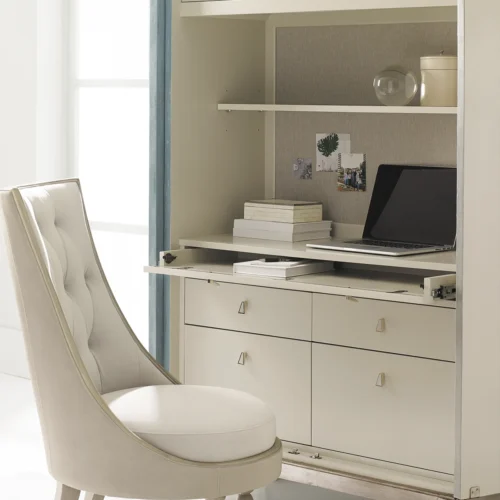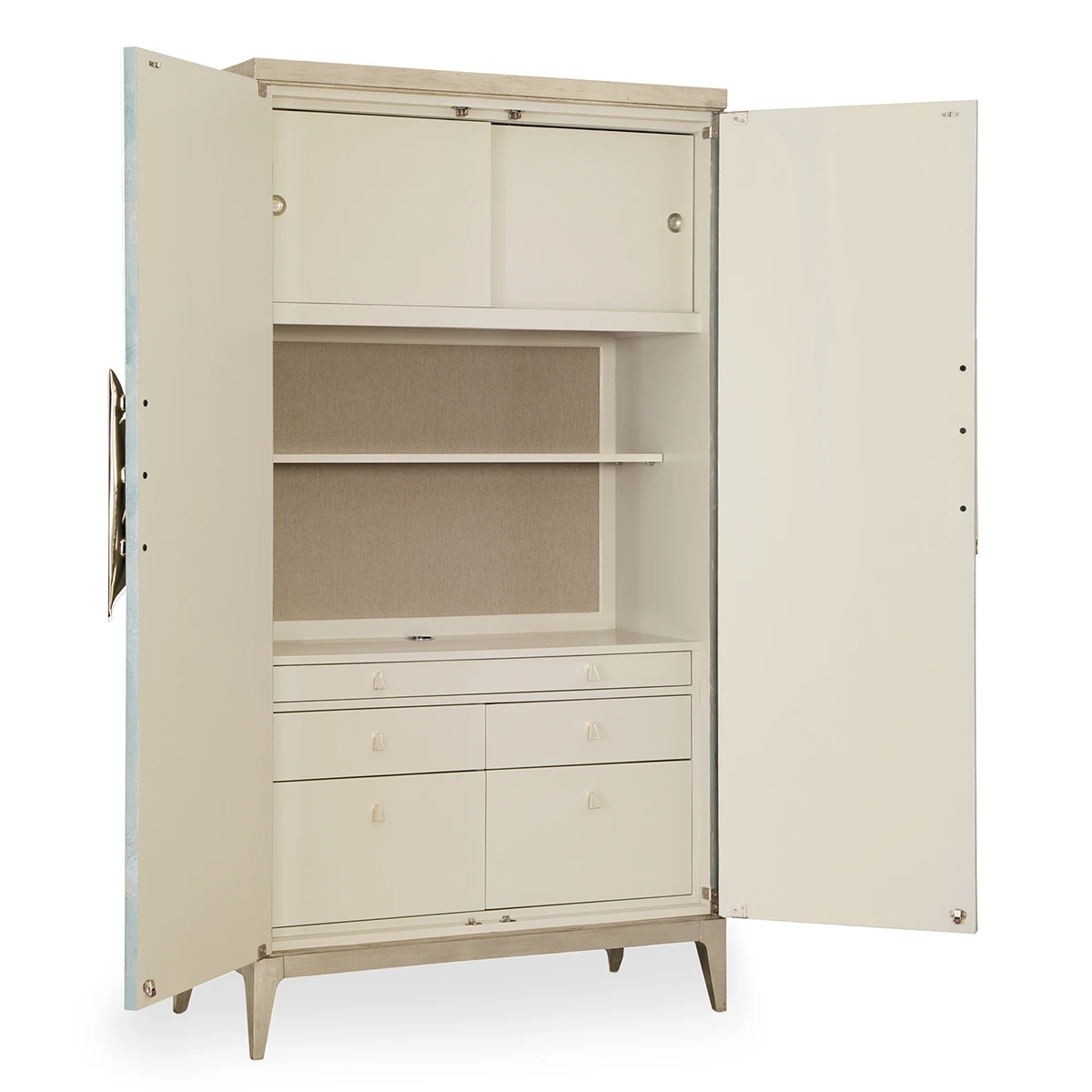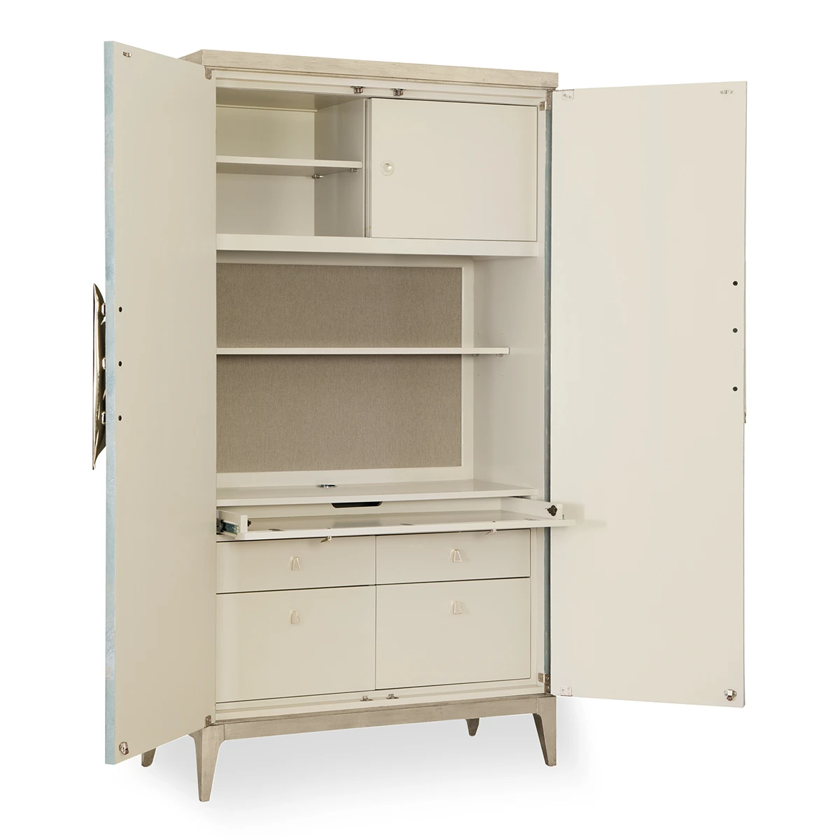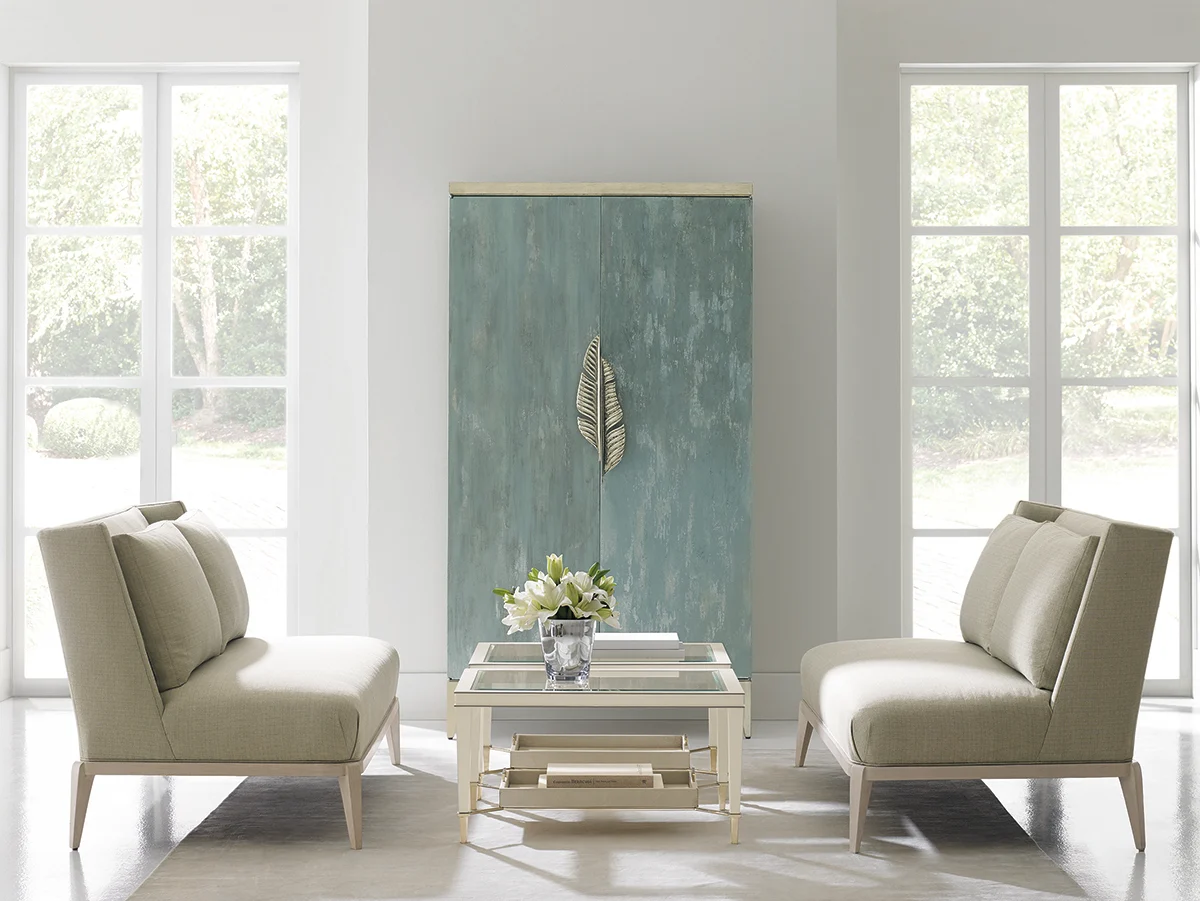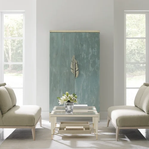 A work of art does not necessarily have to be on canvas. The Ombre Armoires are a vivid testament to this, serving both as an artistic focal point and offering diverse functions for your home. Distinguished by a Tranquil finish in an aqua-infused gray-blue hue, accented with silver leaf, the cabinet sparkles as if illuminating the entire space.