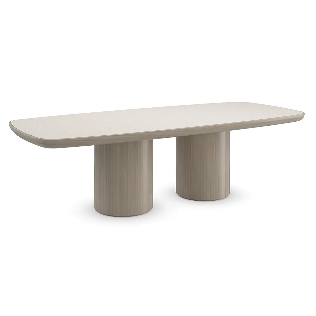 The table is supported by two rounded, cylindrical legs, finished in a gentle sand color, skillfully celebrating the straight grain of the japanese sen wood. This minimalist yet sophisticated design brings a feeling of closeness while maintaining a high-class appeal. With its generous size, the Santorini Dining Table can comfortably seat up to 10, ideal for gatherings with family and friends.