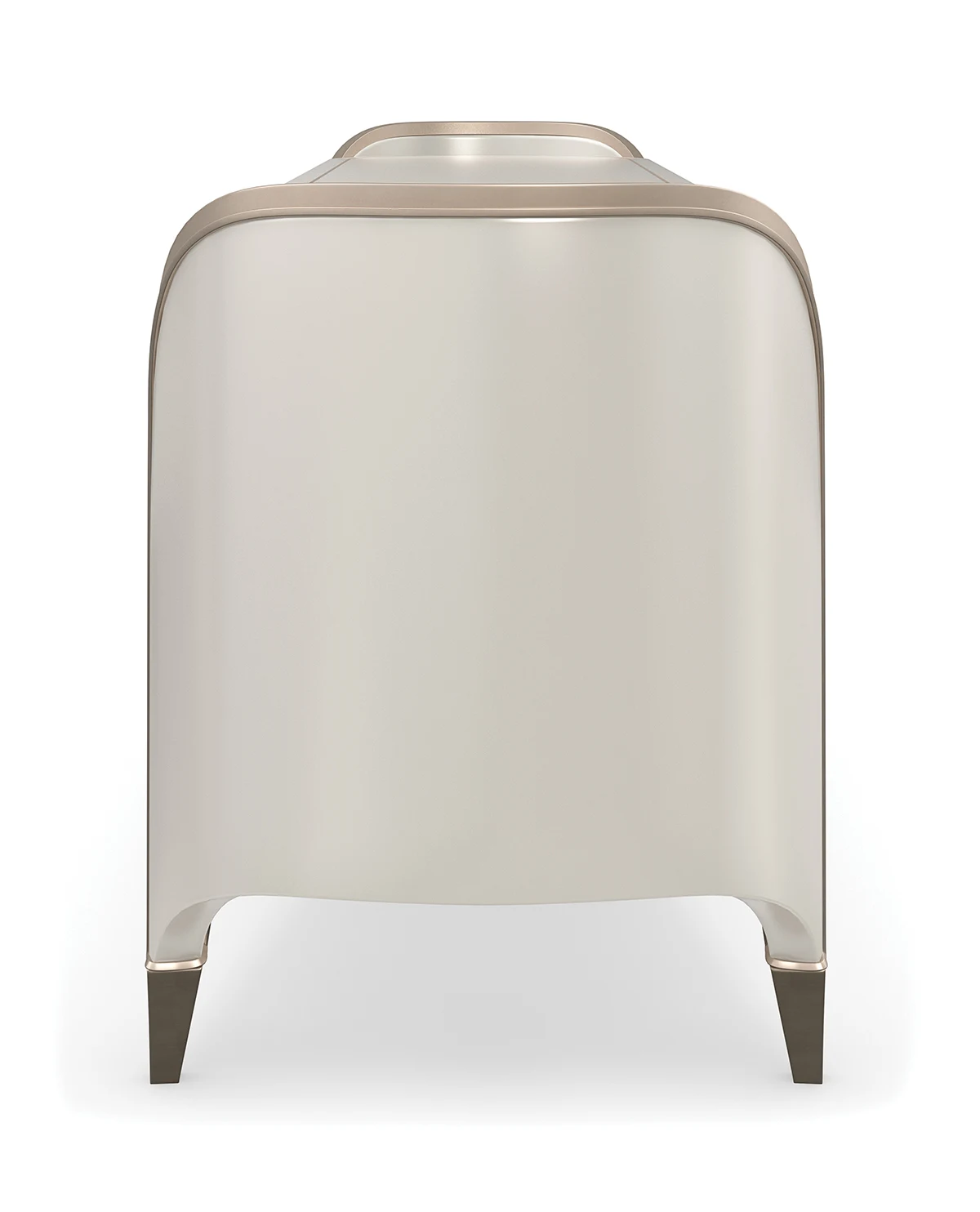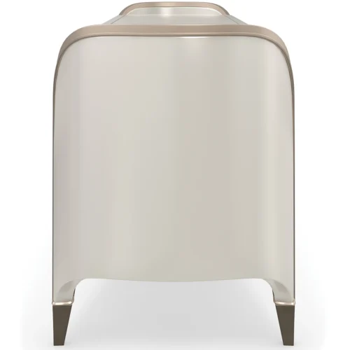 With its captivating, elongated oval silhouette, the Valentina Media Console introduces a luxurious focal point to the living space through the sophisticated blend of materials and colors. Much like a classic french cufflink, the two rounded end panels are accented with molding details and golden shimmer silk-screen printing on the tabletop.