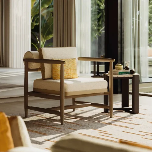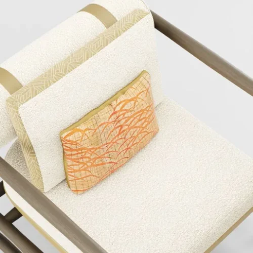 Khung ghế làm từ gỗ đặc xử lý satin mờ, vừa chắc chắn vừa giữ được nét tự nhiên ấm áp. Các chi tiết đồng thau chải mờ tạo điểm nhấn tinh tế, nâng tầm thiết kế thêm phần cuốn hút. Tựa lưng và gối được phối hợp nhiều loại vải khác nhau, mang lại sự tương phản độc đáo và chiều sâu thẩm mỹ.