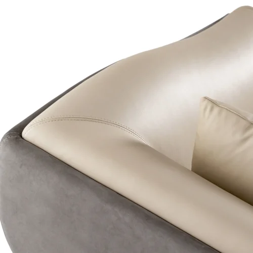 Phần vỏ ngoài được bọc Rustico Nabuk màu Steel với bề mặt mịn sang trọng, trong khi lớp bọc bên trong là da tự nhiên màu 663, tạo nên sự đối lập hài hòa giữa chất cảm mềm mại và cấu trúc vững chắc.