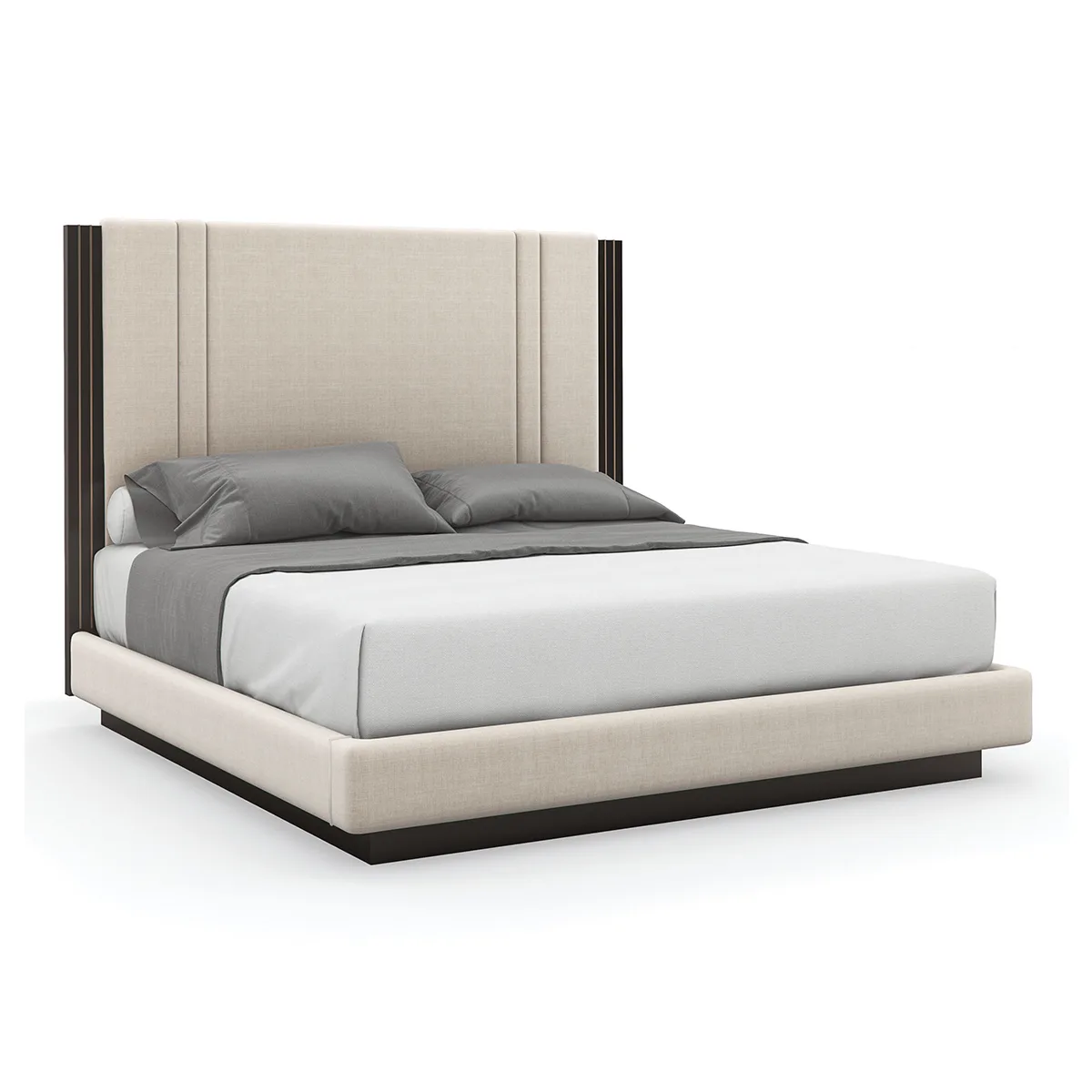 Thân giường với cạnh bên và đuôi giường đều được bọc nệm hoàn chỉnh, đảm bảo sự liền mạch trong thiết kế, trong khi chân đế dạng plinth base vững chãi phủ màu Dark Chocolate tạo sự cân bằng hoàn hảo cho tổng thể.