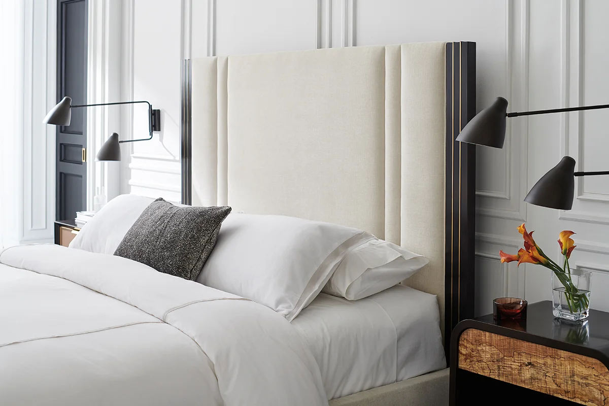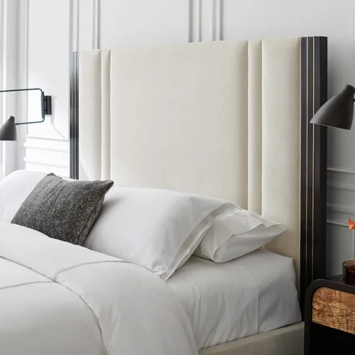 Điểm nhấn ấn tượng nhất của Giường Decent Proposal chính là phần đầu giường cao, được bọc trong lớp vải cao cấp tông sáng, mang đến cảm giác mềm mại và thanh lịch. Chi tiết viền gỗ hoàn thiện màu Dark Chocolate tương phản đầy tinh tế, được tô điểm thêm đường khảm kim loại màu Champagne Gold, tạo chiều sâu và mang lại cảm giác ấm áp, sang trọng.
