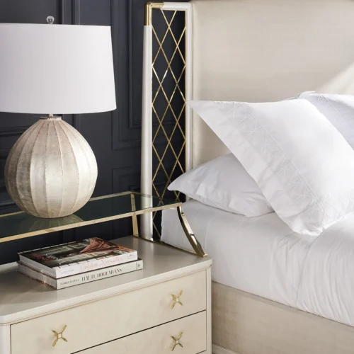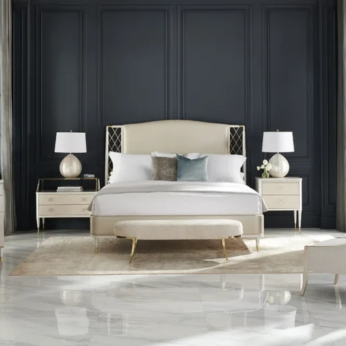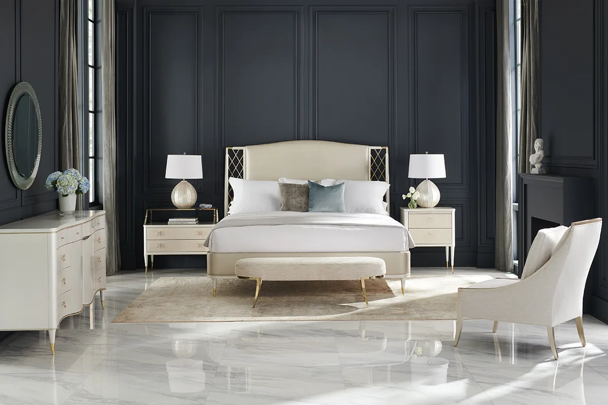 Tựa như bước ra từ một câu chuyện cổ tích, Giường Star of the Night mang đến vẻ đẹp lộng lẫy và đầy mộng mơ. Đầu giường bọc nệm được điểm xuyết bằng khung kim loại uốn lượn tinh xảo với chi tiết ngôi sao lấp lánh, lấy cảm hứng từ những hạt pha lê trang trí trên váy dạ hội. Lớp bọc vinyl ánh bạc vừa sang trọng vừa dễ dàng giữ gìn. Phần khung gỗ và chân vát hoàn thiện màu Stardust phối cùng kim loại ánh Whisper of Gold tạo nên sự cân bằng tinh tế và sang trọng.