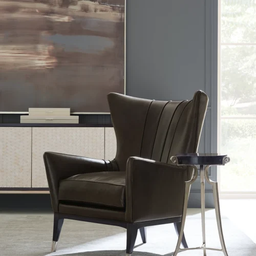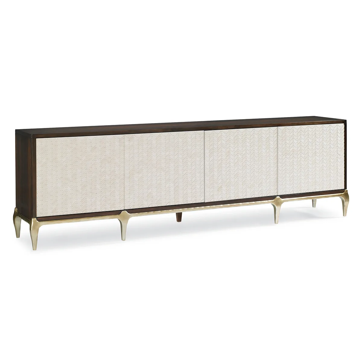 Bốn cánh cửa mở bằng cơ chế chạm nhẹ được tạo nên từ hơn 300 miếng giả xương trắng, mỗi chi tiết đều được gắn thủ công và cố định bằng những đinh đồng thau nhỏ, sáng bóng. Phần chân đế uốn cong phủ lớp sơn Gold Bullion sang trọng, trong khi khung tủ được chế tác từ gỗ cứng và veneer gỗ bạch đàn hun khói, hoàn thiện với gam màu French Roast trầm tối.