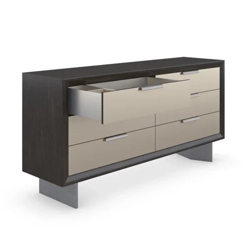 • Sáu ngăn kéo với mặt trước gương đồng, cơ chế đóng êm, ray trượt âm