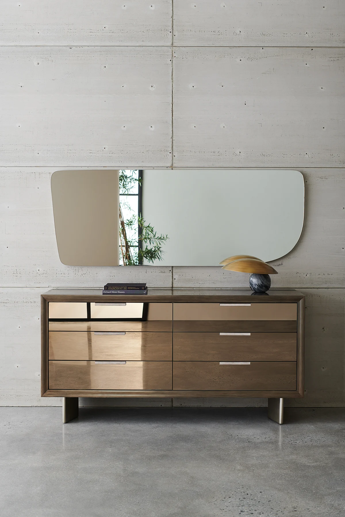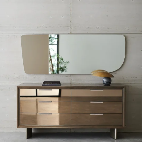 Những đường nét mạnh mẽ cùng bề mặt gương màu đồng tạo nên dấu ấn riêng cho Tủ ngăn kéo La Moda, một thiết kế lấy cảm hứng từ kiến trúc hiện đại. Ấn tượng nhưng không phô trương, sản phẩm là sự kết hợp hài hòa giữa nhiều chất liệu, mang đến vẻ đẹp tinh giản và thời thượng. Các tay nắm kim loại khắc rãnh không chỉ tạo trải nghiệm chạm thú vị mà còn tô điểm cho phong cách tổng thể, trong khi nội thất ngăn kéo hoàn thiện màu Soft Silver mang đến sự sang trọng tinh tế.