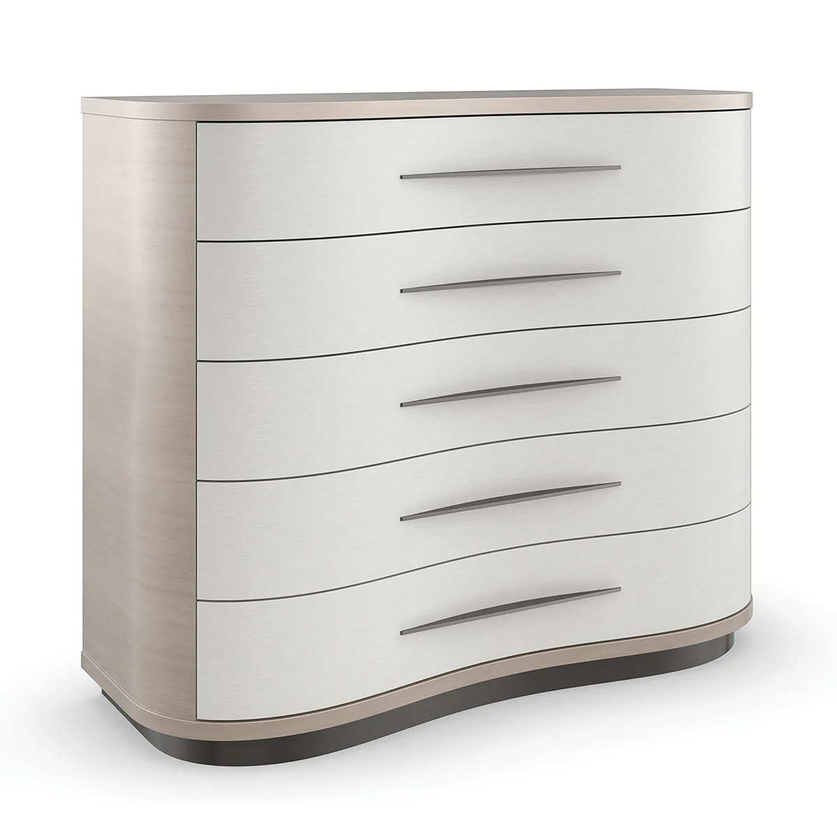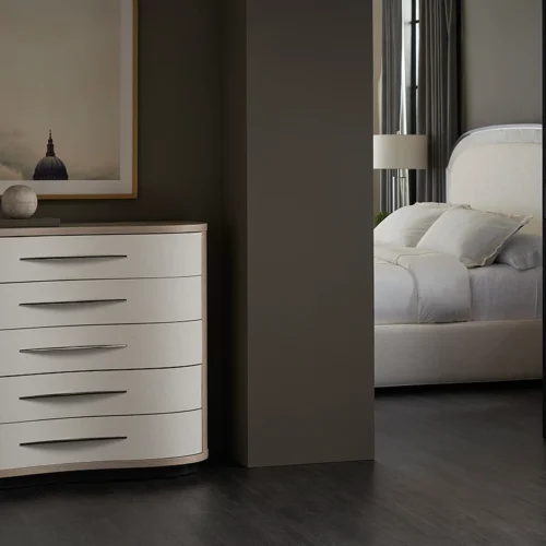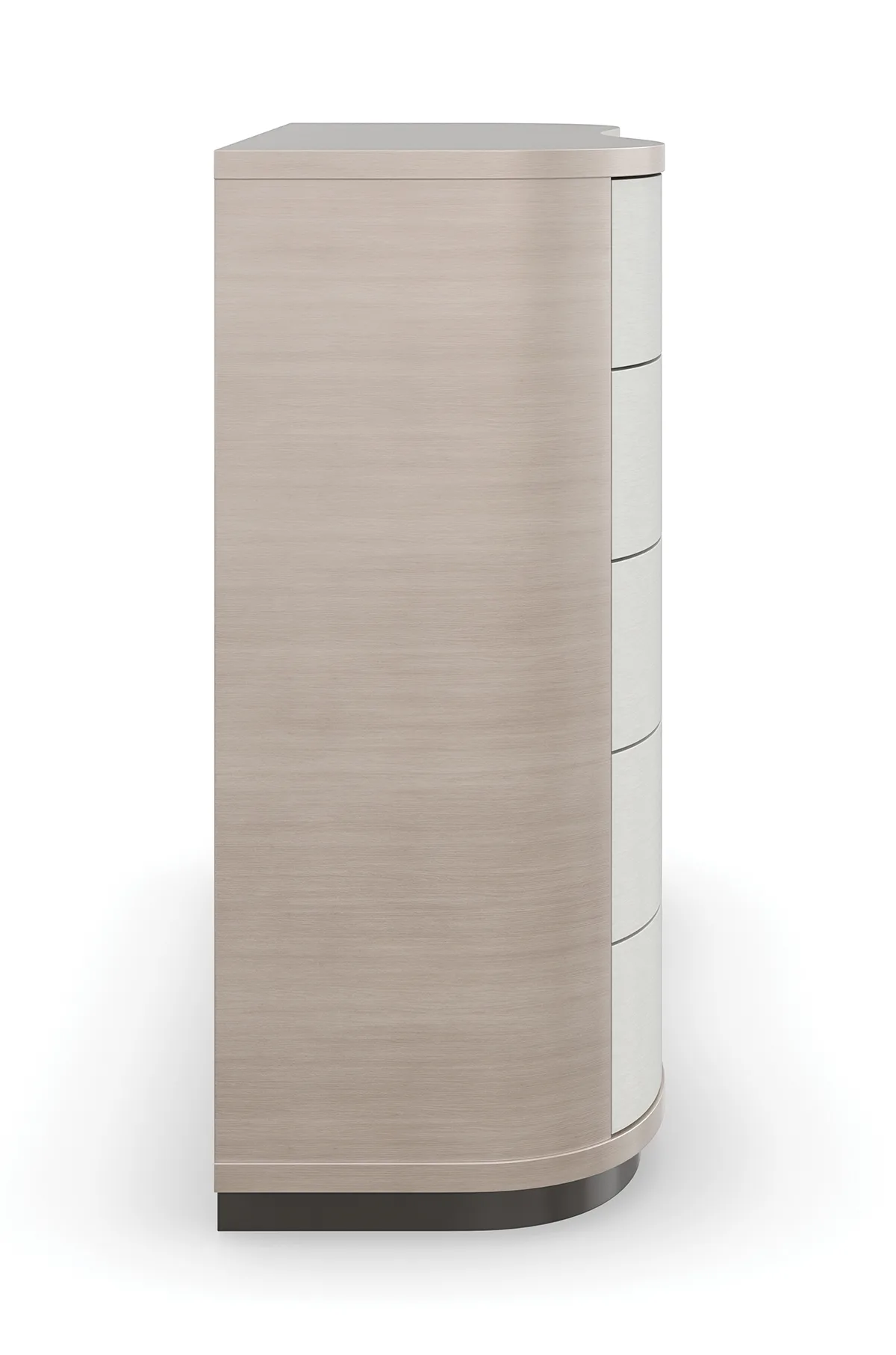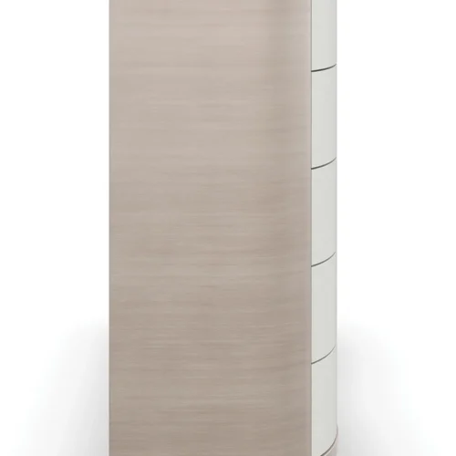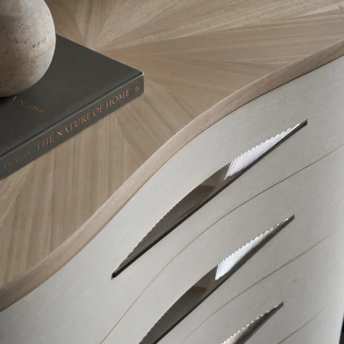 Tự nhiên và mềm mại như dòng chảy, Tủ ngăn kéo Meandrous sở hữu dáng uốn lượn uyển chuyển, tạo nên một điểm nhấn vừa đơn giản vừa thanh lịch mang hơi thở hữu cơ. Các mặt trước ngăn kéo được bọc vinyl, nhấn mạnh những đường cong tinh tế, đồng thời tạo sự tương phản nhẹ nhàng với veneer gỗ Koto hoàn thiện ánh ngọc trai Moonstone.