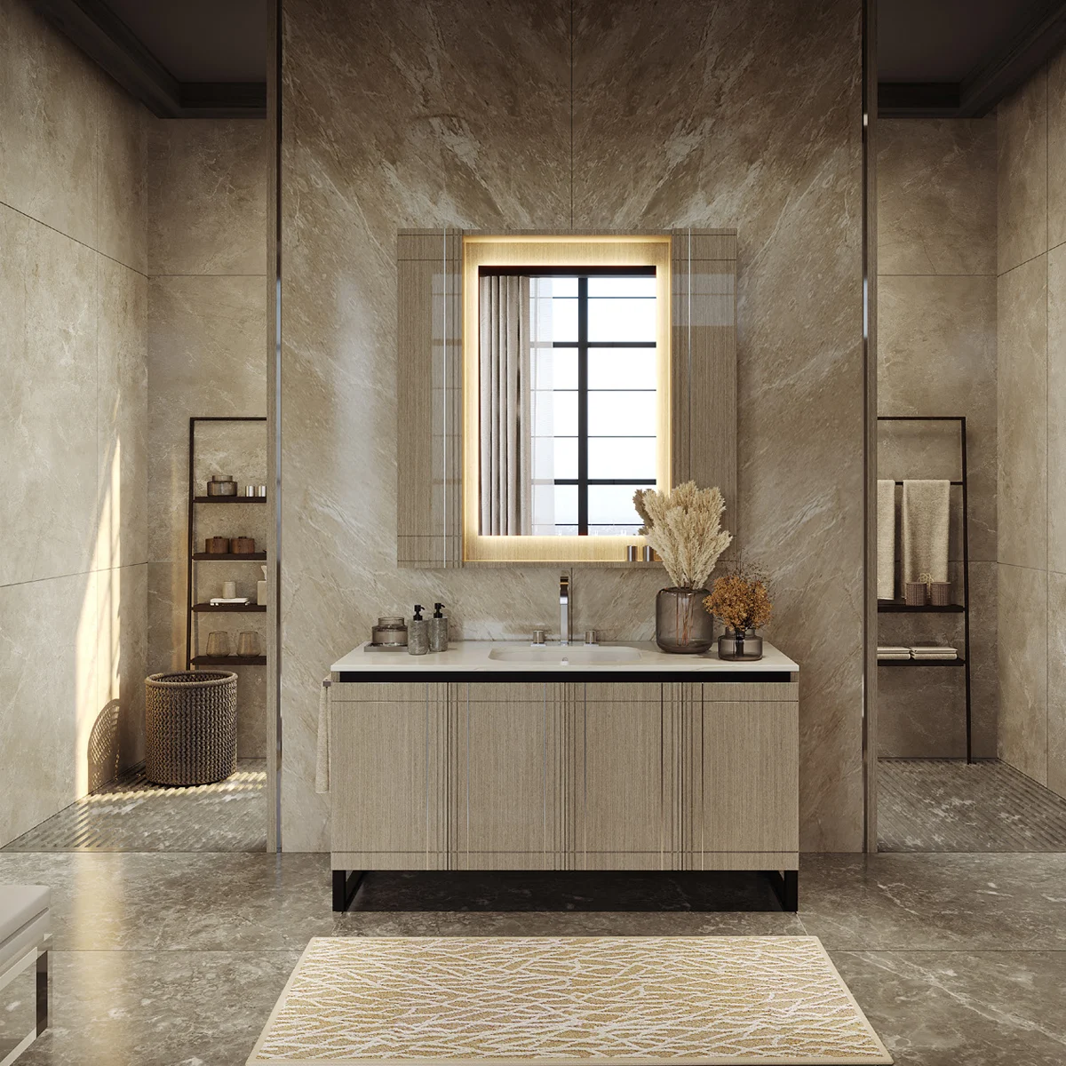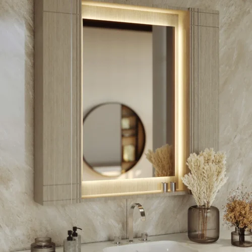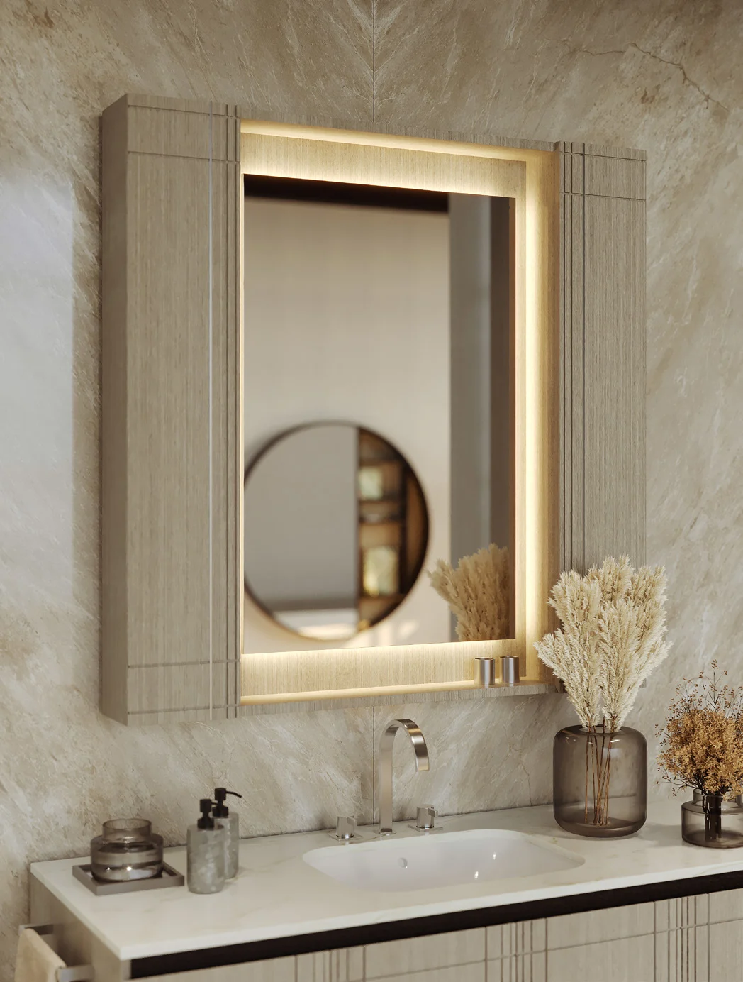 Chiếc gương Coventry được thiết kế đồng bộ với tủ vanity, sở hữu khung gỗ veneer bóng bẩy, điểm xuyết thép đánh bóng và bề mặt gương tinh giản. Đặc biệt, gương có thể tích hợp hệ thống đèn nền, tạo ánh sáng dịu nhẹ và bầu không khí thư thái cho phòng tắm.